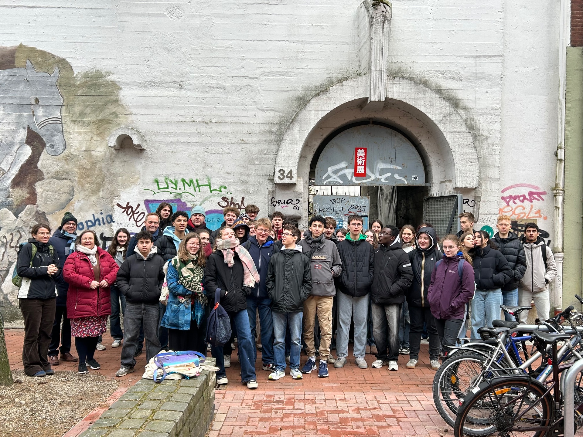 Das Bild zeigt die Schülerinnen und Schüler vor dem Bunker in der Scheibenstraße, nach einer interessanten und lehrreichen Führung.